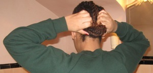 Then stuff the extra hair downward into the middle of the twist. Keep stuffing the extra hair into the twist and also roll the sides of your hair in toward your head (see top picture on right).